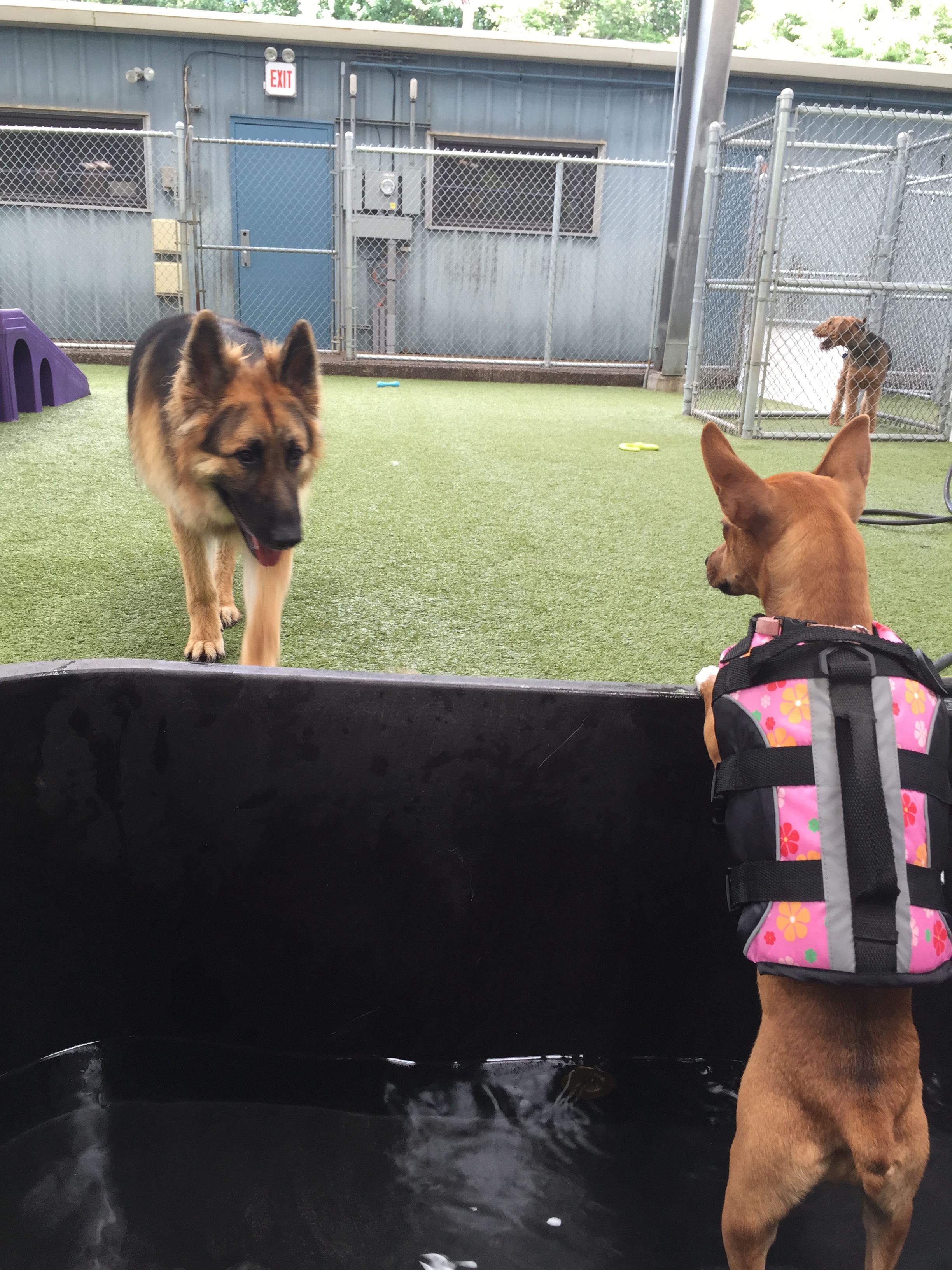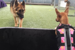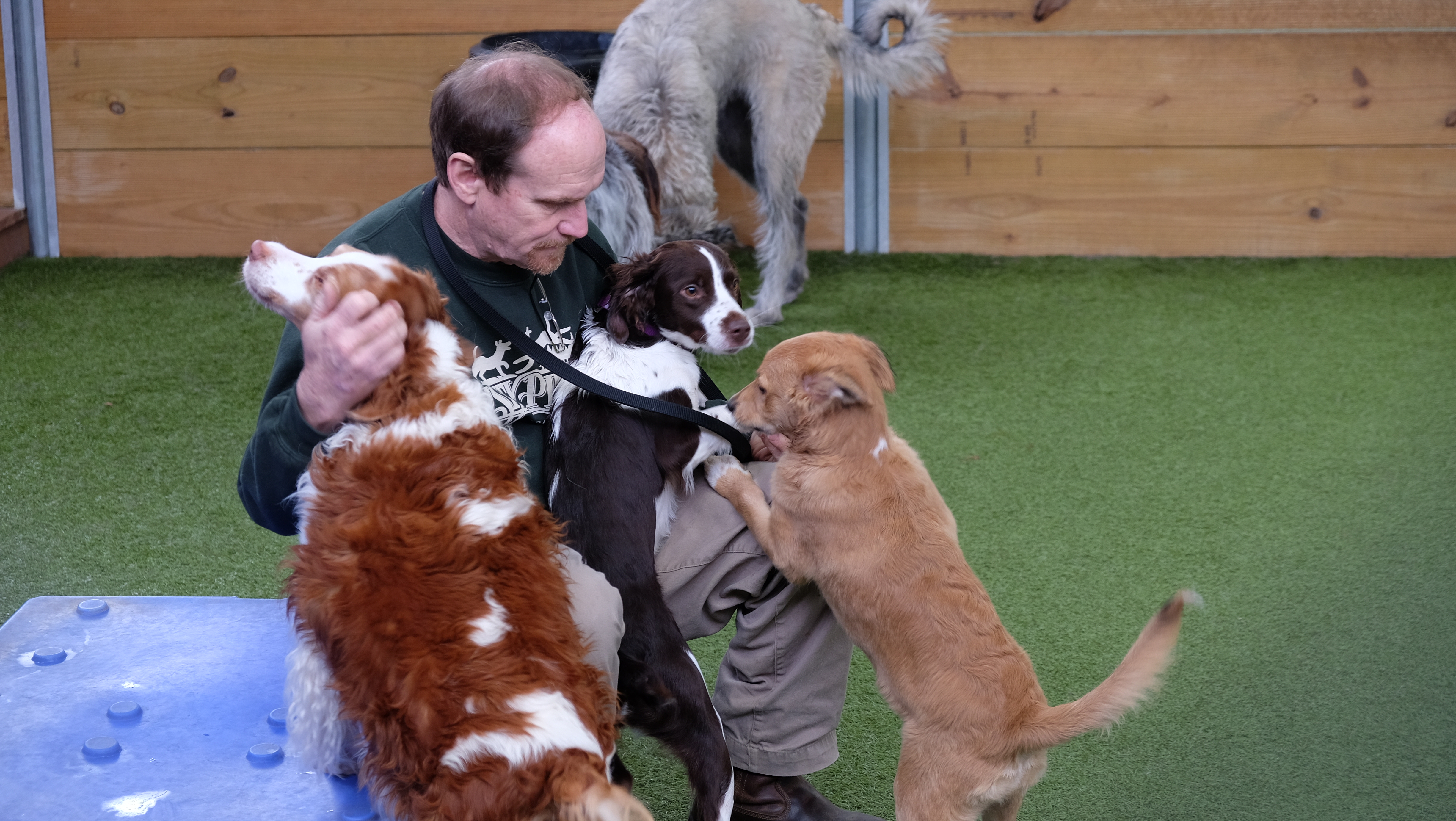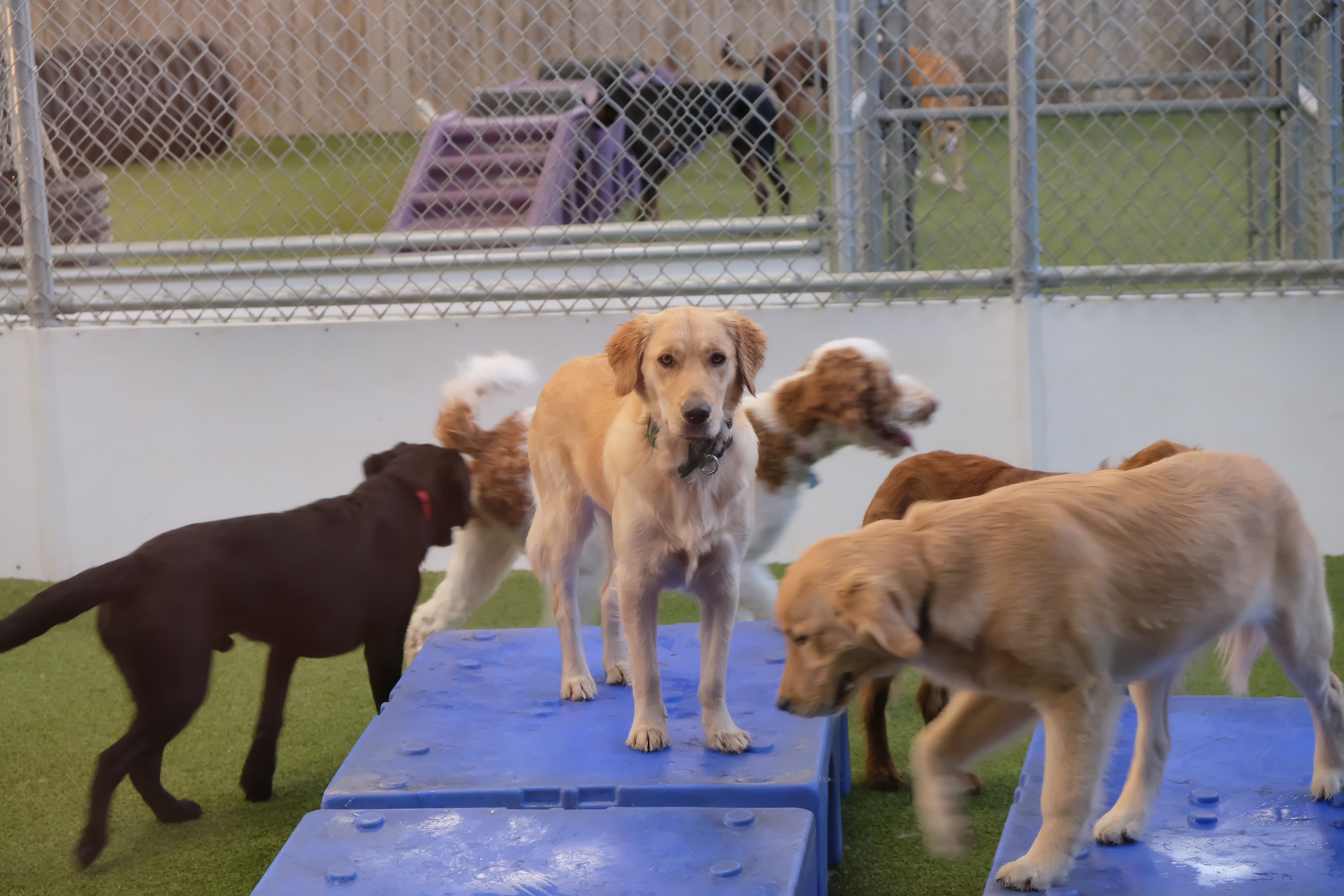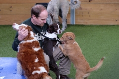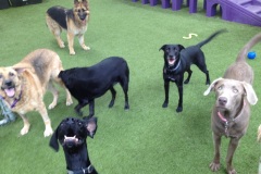 Interactions with humans and dogs. Socialize and play with selected friendly dogs of a similar play style and age in our unique sky lighted pavilion exercise yards while being monitored and supervised to ensure the play remains appropriate, fun and safe for everyone. All dogs socializing with other canines are given periodic breaks to calm, and mentally process what they have learned socially. This also gives them an opportunity to positively experience being kenneled for future boarding (with all the new sights and sounds that go along with it), should you require a home away from home when going on vacation.