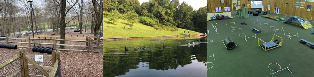 The outdoor Dog Park or pond pavilion are great a unique party or get-together. The fenced-in agility yard provides safe access to numerous obstacles for dogs to enjoy and seating is available for owners. Our 25 acres of grounds and trails are available to renters as well.